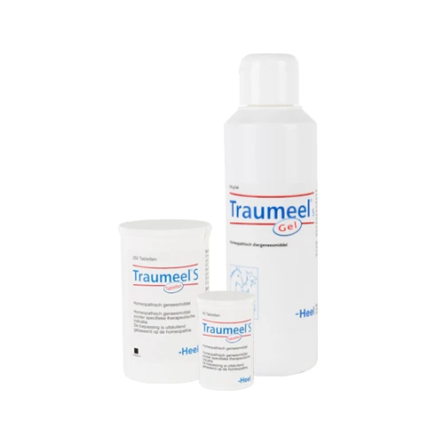 Traumeel van Heel is een homeopathisch geneesmiddel voor honden, katten en paarden. Traumeel heeft een ondersteunende werking in het geval van acute en chronische aandoeningen van het bewegingsapparaat. De gel draagt bovendien bij aan vermindering van zwelling en pijn en bij ontstekingen. Traumeel gel is zeer geschikt voor gebruik in periodes van herstel. Tevens is het product bijzonder geschikt om te gebruiken bij paarden die gevoelig zijn op de singel. Ook verkrijgbaar in tabletvorm en als druppel.